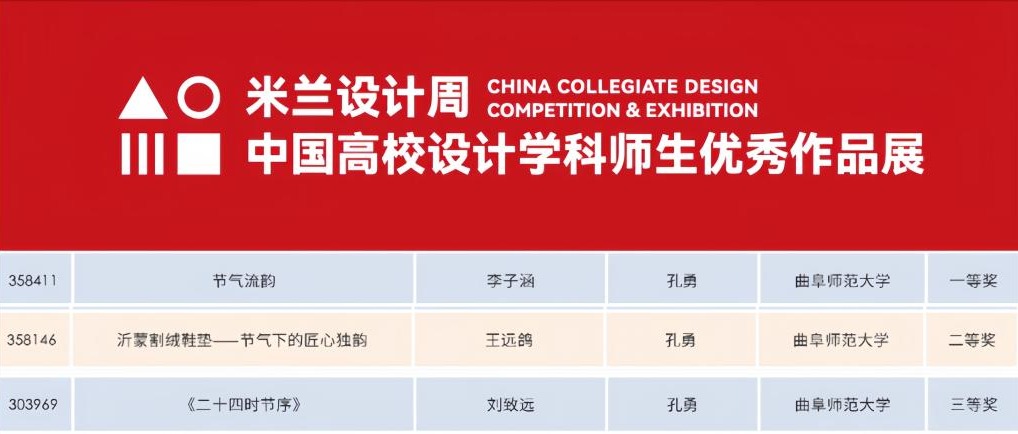 教师孔勇指导,2024级传媒学子李子涵创作的作品《节气流韵》荣获国家级一等奖,2024级传媒学子王远鸽创作的作品《沂蒙割绒鞋垫——节气下的匠心独韵》荣获国家级二等奖,2023级传媒学子刘致远创作的作品《二十四时节序》荣获国家级三等奖,充分展现出传媒学子扎实的专业水准和独出心裁的创新精神。