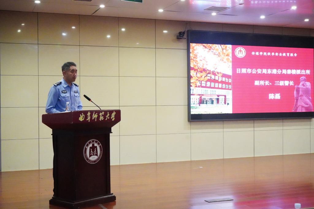邀请日照市公安局东港分局秦楼派出所副所长陈磊、日照市心脏病医院医师戴启睿于图书馆报告厅为传媒学子作安全教育讲座。日照校区党委副书记刘天浩、保卫处副处长王光江、学生工作处(武装部)副部长赵秀臣、教务处副处长孔峰、麻豆视频av