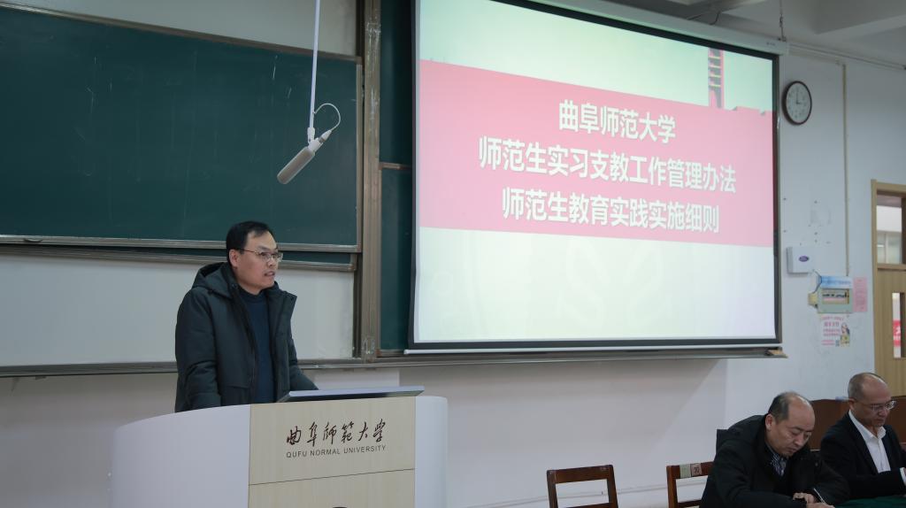 在JA105召开2023级教育技术学专业教育实习动员大会。日照市田家炳实验中学副校长宋文、学院党委副书记田荣林、副院长赵可云、教育技术学专业副主任吴运明及实习指导教师出席会议。会议由2023级辅导员程西永主持,2023级教育技术学专业全体学生参加。