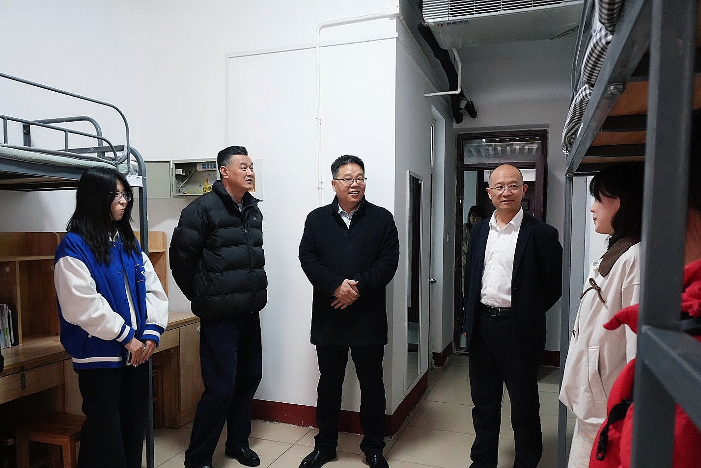 党委书记田维柱、院长王焕景、学工处副处长曲涛、党委副书记田荣林、副院长赵可云、副院长刘波及各年级辅导员一同前往东升园、文泽园学生宿舍开展走访工作。