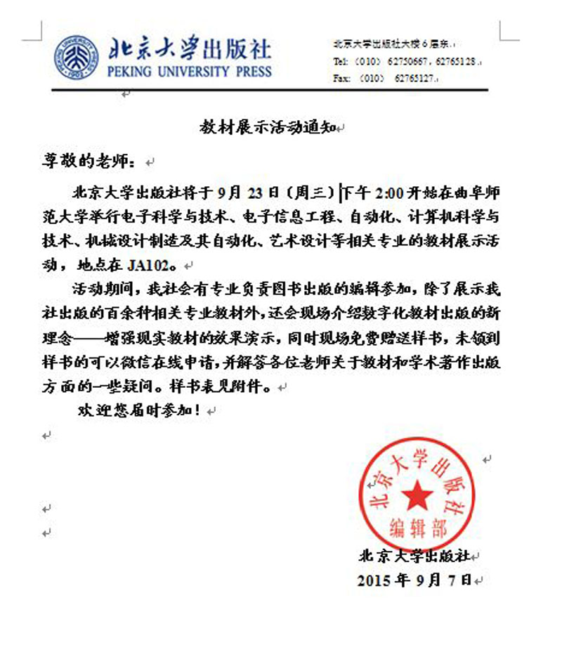 【来源:北大出版社9月23日来日照校区展书、送书 | 发布日期:2015-09-08 】