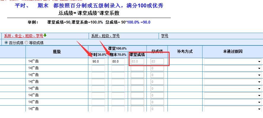 平时成绩90分,录入90;期末成绩80分,录入80.课堂成绩和总成绩在“暂存”之后,系统会自动计算。