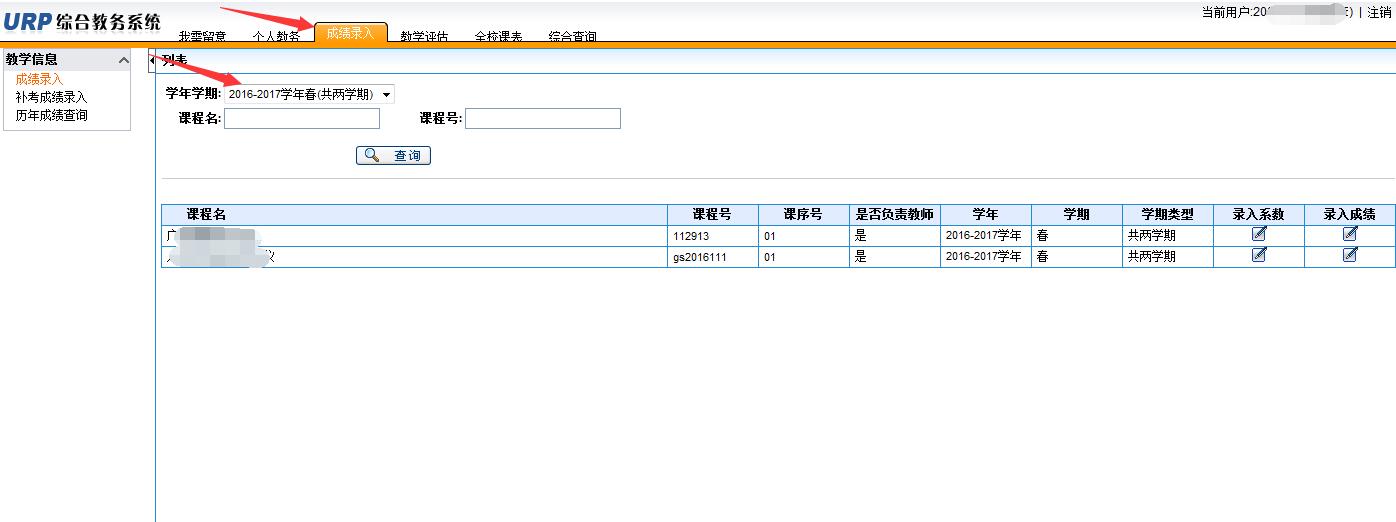 2.进入教务系统后,点击成绩录入,可以发现本学期课程列表(如果课程信息不正确,请注意选择学年学期),如图:
