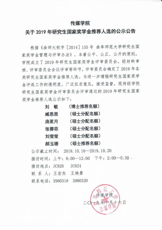 【来源:麻豆视频av 关于2019年研究生国家奖学金推荐人选的公示公告 | 发布日期:2019-10-16 】