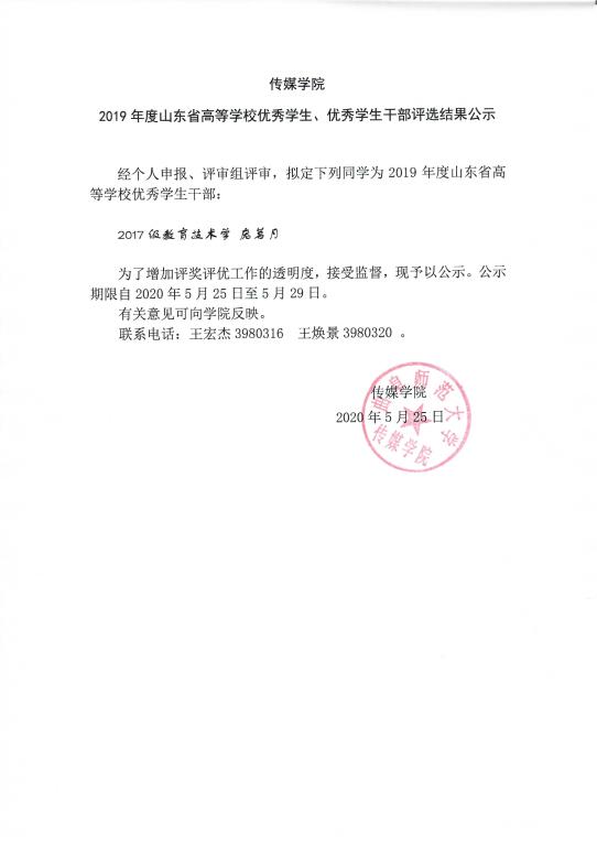 麻豆视频av 2019年度山东省高等学校优秀学生、优秀学生干部评选结果公示